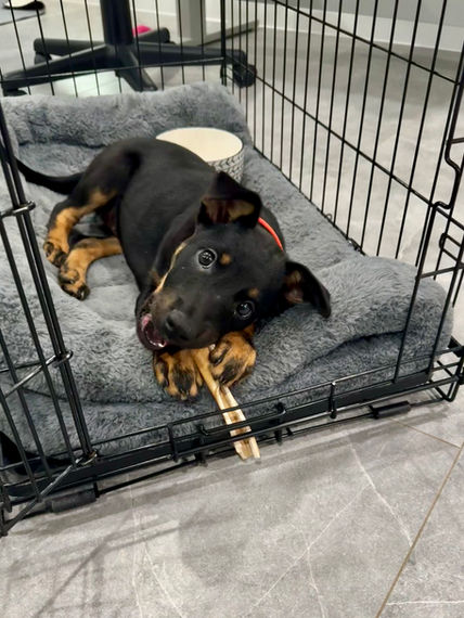 Firecracker (nicknamed Sketti) is an adorable BC and Kelpie mix pup who loves nothing more than to get belly rubs from everyone she meets. She loves to play with toys, running after a ball and playing in water! Of course, her absolute favorite thing in the world is getting cuddles and following her humans around and she already has amazing good recall for a pup of her age. Sketti is great on a leash (and keeps a loose leash most of the time), very well crate trained and will go run to her crate on her own to wait for her meals and is housebroken.