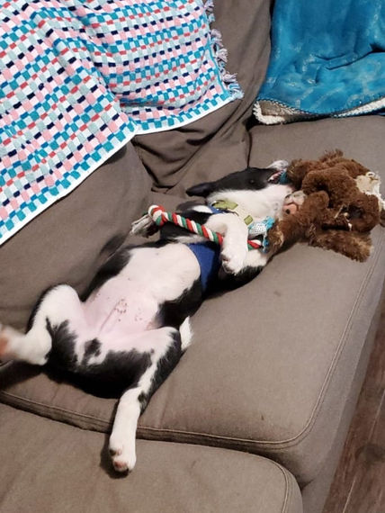 He is a active puppy who always has a blast wrestling with his siblings but has a good off switch too and likes taking lots of puppy naps(kips) in his bed! He enjoys self entertaining with toys in his crate and bed too. His favorite toys are stuffies that he can hold and dogwood bones!